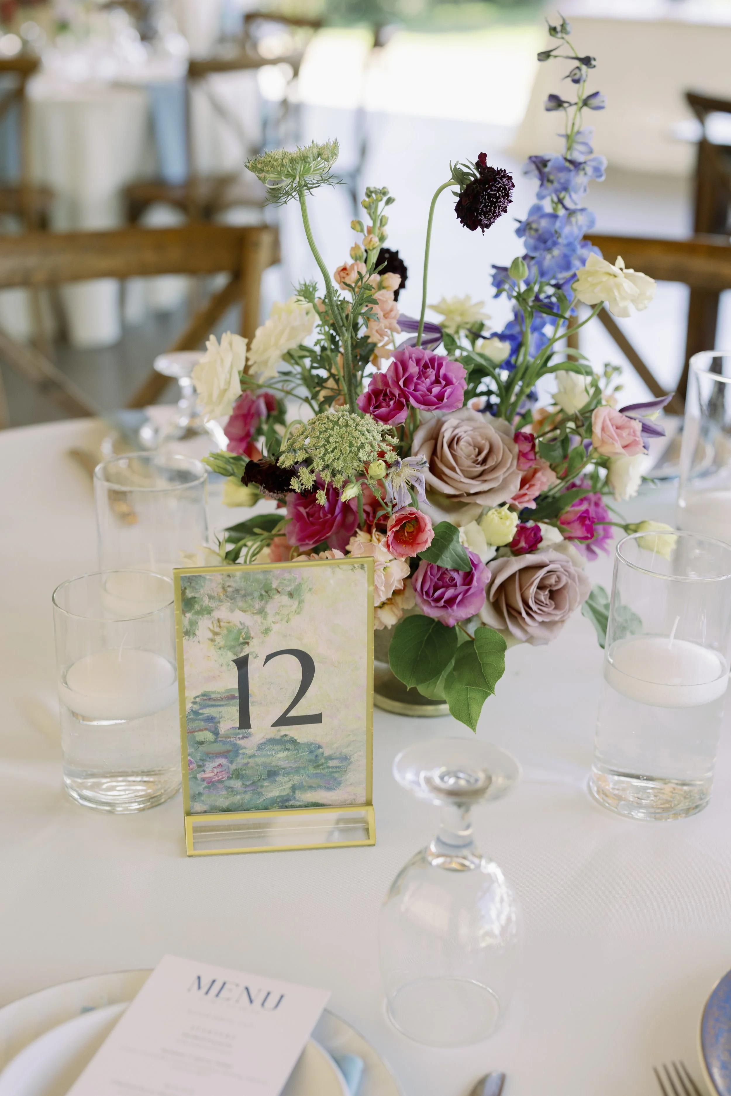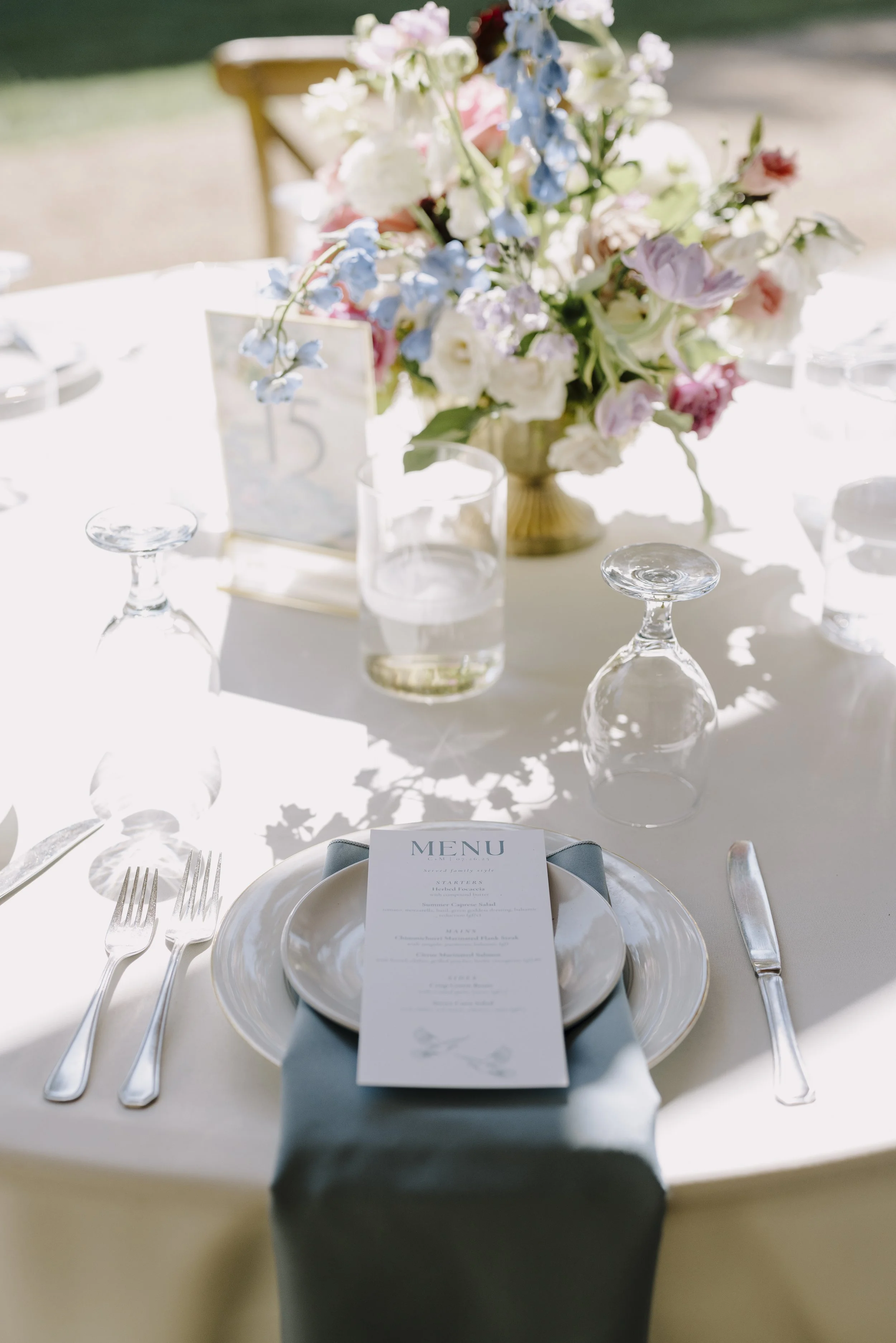 Elegant outdoor table setting with a large pink and purple floral centerpiece, gold cutlery, glasses, and a white tablecloth.