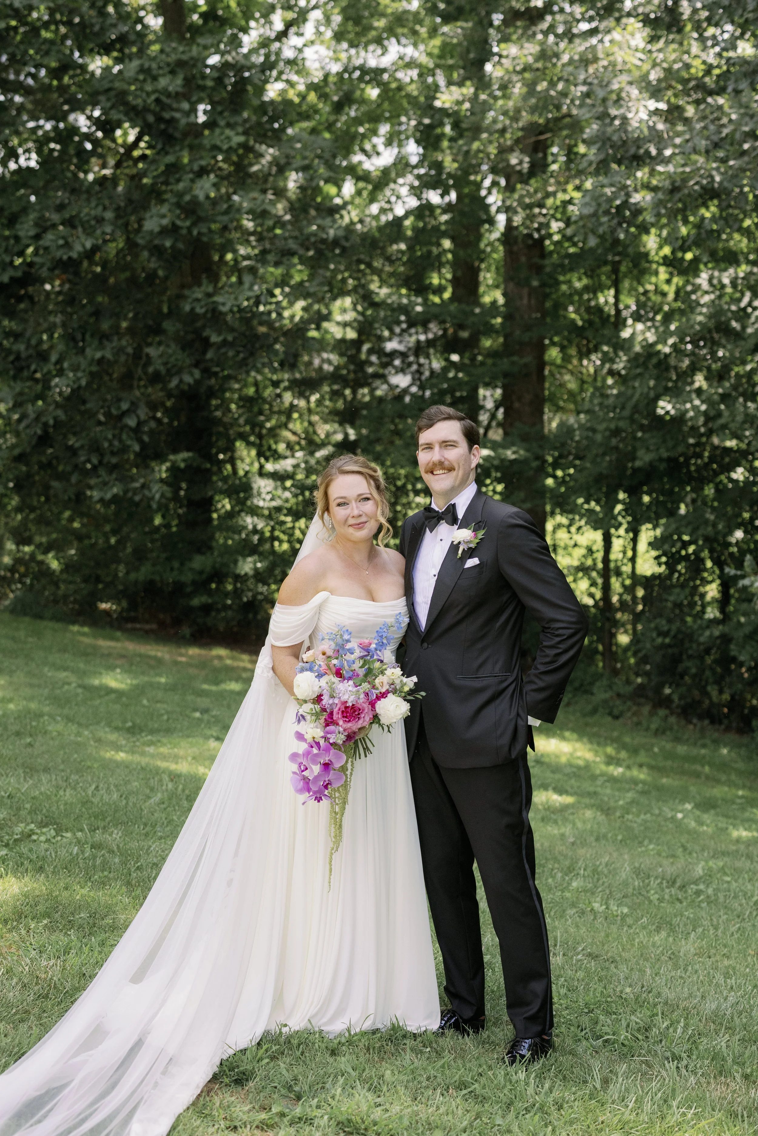 Bride in a white wedding dress holding a bouquet with pink and purple flowers, standing outdoors in front of a green floral arch on a grassy area, with trees and a house in the background.